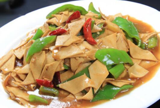 干豆皮和尖椒搭配在一起炒着吃特别好吃,在做的时候需要把准备好的青尖椒洗净,切成滚刀块,再把干豆皮也切成滚刀块,在炒锅中放适量食用油加热后放入尖椒炒软,然后把干豆皮入锅翻炒均匀,放生抽蚝油和食用盐调味,炒熟以后直接出锅就可以。