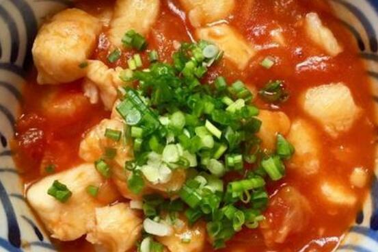2、番茄用开水焯烫以后去掉表皮切成小块,在炒锅中放适量食用油加热,把番茄入锅炒成泥,再放入适量的香葱末,随后加适量清水煮开后,把龙利鱼肉入锅煮2~3分钟,放入白糖,食用盐和黑胡椒粉以及少量的玉米淀粉再煮一分钟就能出锅。