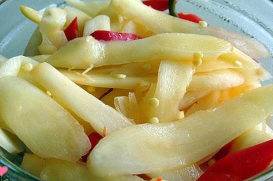 2、处理好的连子姜放到盆中加入适量食用盐调匀以后腌制三小时,腌好以后的连子姜取出来再放到清水中浸泡,三小时以后取出,在浸泡连子姜的同时要把清水和白糖一起入锅煮开,再放入白醋,加入食用盐,调匀以后降温备用,最后把连子姜放到瓶子里加调好的料汁浸泡就可以。