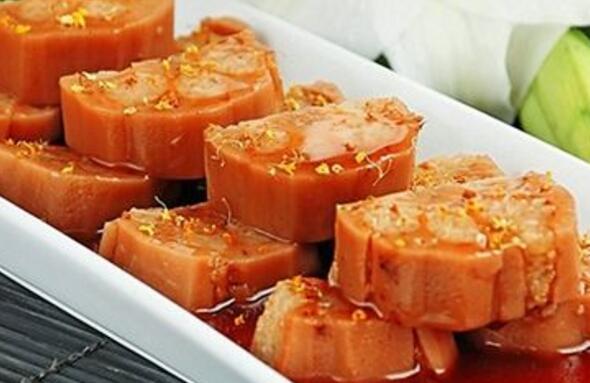 4、煮好以后的莲藕取出切成片状摆放在盘子中,再把锅中的汁取出来,直接浇在上面,最后撒上糖桂花就能上桌食用。糖藕的做法并不复杂,但他在制作时有一定的窍门,在煮的时候不但要控制好时间,而且要控制好火力,只有这样才能把莲藕中的糯米完全煮熟,才能让做好的糖藕口感好。