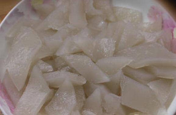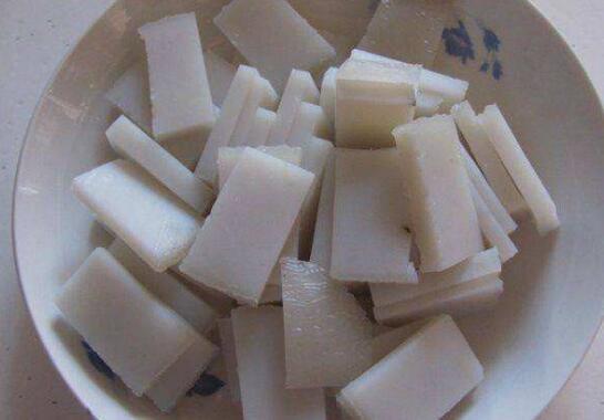 3、等锅中的粉坨蒸好以后取出晾一会儿,然后让他从盘子中脱落下来,它降温以后再把它切成块状装盘,最后就可以按自己的需要去烹调食用它,它既可以凉拌也可以用来炒着吃。