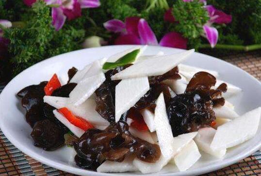 2、在炒锅中放适量食用油,加热后把葱花入锅炒香,再把山药入锅快速翻炒,放少量生抽和香醋炒匀后把准备好的黑木耳入锅,放少量食用盐一起炒匀,炒到山药和黑木耳熟透,炒好以后直接出锅装盘就能食用。