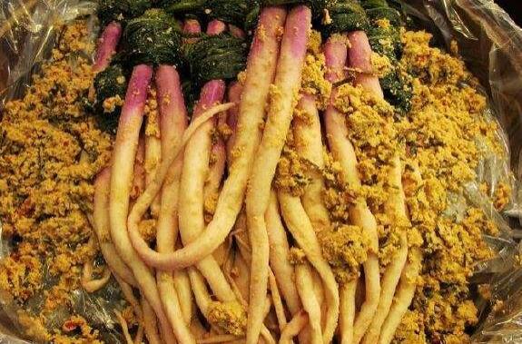 2、对自己的需要准备适量的黄瓜,青瓜以及茄子,还有白萝卜等食材,把它们全部洗净以后,处理成自己需要的样子,控干表面的水分,加入适量食用盐,调匀后腌制一会儿再放入到调好的米糠糊状,放到阴凉通风的地方,胭脂24小时取出,洗掉表面的米糠就能得到好吃的米糠酱菜。