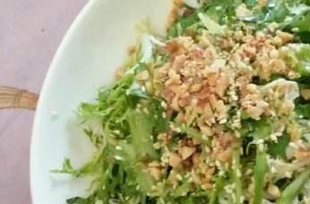 3、在凉拌苦菊的时候,还可以加入一些花生米。先将苦菊清洗干净,再将其切成段状装进大盘子里面。将剥好的花生放进油锅里面,快速翻炒,这样可以防止花生米烧焦,再加入一些盐。炒好之后,将花生米倒到盘子里面,加入些许白糖、盐和鸡精、生抽、辣椒油等调料,调匀即可。