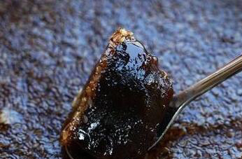 4、熬15分钟左右,锅中的阿胶就能变成浓稠的膏状,这时再把准备好的桂圆肉,红枣以及核桃仁刚才一起放入锅中快速搅拌均匀,再继续用小火熬制10分钟左右。准备一个方形的盒子,在它的内壁上涂抹适量食用油,把熬好以后的阿胶膏取出后直接放在盒子中把它摊平压实,等它降温以后入冰箱冷藏12小时,取出后再把它切成厚薄均匀的片状,这时自制的阿胶糕已经做好,想吃时取出两片直接食用就可以。