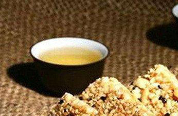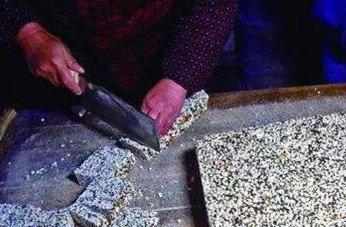 2、将核桃去壳,将核桃肉切碎,将核桃肉和葡萄干倒入到里面,搅拌均匀,之后,再加入些芝麻。芝麻容易变糊,所以,可以晚一点加入。接着,将炒米也倒入进去,快速将其搅拌均匀,看到其变得非常粘稠了,就熄火。将炒米糖倒入到盘子里面,用刮板压平整,再倒出来。待其稍微冷却之后,用到切成均匀的块状。