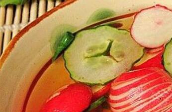 3、把适量的清水倒到无油的锅中,加入适量花椒和八角以及桂皮和宵夜还有冰糖等多种调味料,加热煮开,等它降温以后,直接倒入到泡菜坛子中,然后再放入带汁的野山椒,随后放入高粱酒,最后才能把晾干水分的蔬菜放入的泡菜汁中。