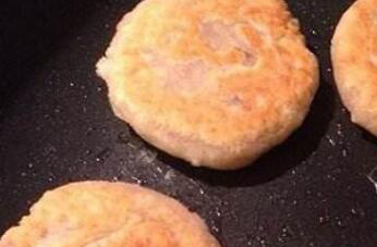 2、蒸好以后的芋头取出,放在面板上,压成泥状,再加入准备好的糯米粉和白糖调匀,在平底锅中放油加热,把调好的芋头女儿放在手中,团成团状,再把它压成小饼的样子,放到平底锅中煎到两面金黄,取出以后用吸油纸把油吸干就可以。
