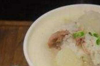 2、把煮鸭肉的汤取出以后,放到砂锅中,加入淘洗干净的大米一起煮开,再把洗净以后去皮的山药切成段状放到锅中,和大米一起煮,等锅中的粥煮到软糯粘稠以后关火,把煮好的鸭肉切成块状以后放在粥中调匀就能出锅。