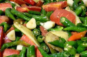2、把准备好的青辣椒洗净以后,去掉水分,切成块状,再放入适量食用盐,大蒜去皮以后切成蒜片,生姜也切成片状,和辣椒放在一起调匀腌制。洋葱切成丝状以后入锅翻炒一下,炒到洋葱变软以后取出降温,和辣椒放在一起。