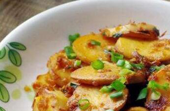 3、在炒锅中放食用油,用小火加热后把杏鲍菇片入锅,慢慢煸炒,吵到它表面为金黄色以后取出,再把洋葱放入锅中炒出香味随后把杏鲍菇二次入锅,加食用盐和胡椒粉调味,炒匀以后就能直接取出食用。