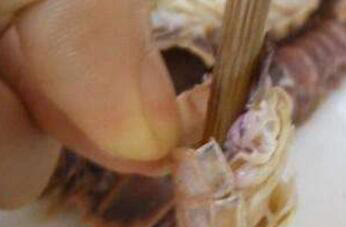 3、新鲜大虾去掉外壳以后还不能直接吃,还要用刀在它的背部划一下,把它里面的虾线全部清理出来,然后再把虾肉放到流水下冲洗,冲洗干净以后虾肉就可以按自己的需要去具体烹调食用了。除了这种方法以外,把新鲜大虾用沸水焯烫以后也能快速去掉外壳,去壳方法与冷冻以后相似。