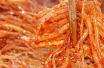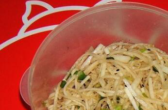 3、把苤蓝丝与姜丝和辣椒丝以及蒜片放在一起加入准备好的所有调味料,用干净发的筷子把它闪调匀,放到一个干净的盆中中,再把盆放在阴凉透风的地方腌制五到七天以后里同的苤蓝咸菜就能腌好。
