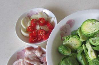 3、在锅中放清水加热烧开以后把抱子甘蓝入焯一下,取出以后过冷水降温,炒锅中放油加热以后放入蒜末炒香,随后放入培根炒出油脂,再把抱子甘蓝入锅,快速翻炒,炒软以后加食用盐再炒二分钟左右直接出锅就可以。