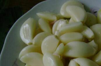 3、人工拨大蒜头,还可以把它提前放在清水中浸泡一小时,大蒜的蒜皮在吸水以后会变得松散膨胀,这时的蒜皮与里面的蒜瓣会自然分离,把它们取出以后,用力压在地上,白白胖胖有蒜瓣就能自己跑出来,蒜皮能一下子去除干净。