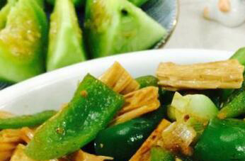 3、把切好的青椒放在花椒油中,再放入切好的腐竹快速翻炒,加入准备好的食用盐和鸡精调味,炒到青椒和腐竹熟透以后直接出锅就能食用。