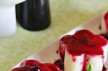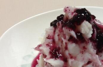 4、把准备好的蓝莓酱加入糖和清水,调匀粘稠的稀糊状,从面而下淋在盘中的山药泥上,然后入冰箱冷藏几个小时,取出食用,口感特别好。