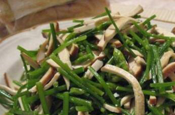 韭菜苔炒香干也特别好吃,在炒制时需要把韭菜苔提前洗净,切成段状,香干也切成条状,再准备适量的葱花和食用油。在锅中放食用油,加热以后,把葱花入锅炒香,随后把韭菜苔放入锅中,快速炒制,翻炒均匀以后,把香干入锅一起炒,加少量生抽和少许盐调味,炒到韭菜苔熟透以后加鸡精提味,直接出锅就能食用。