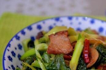 3、在锅中放油以后加热把腊肉片放到锅中炒制,炒到腊肉发亮接近透明状以后加入葱花炒香,随后才能把白菜苔放到锅中炒制, 两三分钟以后加生抽提味,然后再放食用盐。