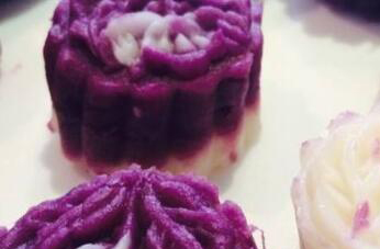 2、把制好的紫薯山药泥中加入少量糯米粉,调匀以后合成面团,再把它们分成小块,制成自己喜欢的样子,这时自制的紫薯山药糕也就做好可以食用了。如果家中没有专业工具,可以使用家中好看的瓶子盖来给紫薯山药糕做造型,做好以后也特别好看。