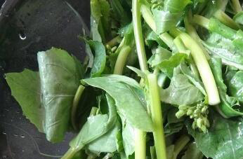 2、把腌好以后的油菜苔用清水冲洗干净,洗掉它表面残留的盐,再把表面的水分全部挤干,并放在阴凉的地方晾一到两天。
