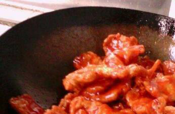 4、在炒锅中留适量底油加热以后放入蒜蓉炒香,随后放入准备好的番茄酱炒匀,再把炸好的猪肉块儿放到锅中用小火炖制2到3分钟,让他们表面都均匀沾满番茄酱,就可以直接出锅装盘。
