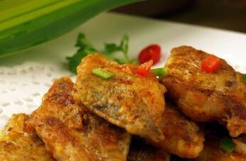 4、在锅中放食用油加热到七八成热时吧,准备好的带鱼段放入锅中炸制,炸到它表面金黄色后取出沥掉多余的油装盘以后撒上椒盐就能食用。