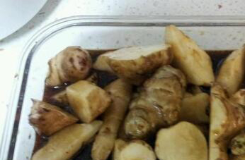 2、把准备好的洋芋头洗净以后,阳光下晒着,晒成半干以后再放入容器中,加适量盐和清水腌制。过20天以后,把腌好的洋姜从盐水中取出晾晒2到3天。