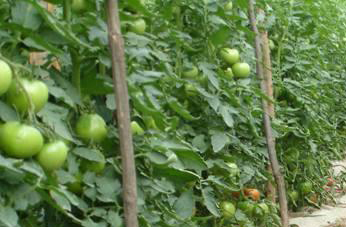 (6)双杆整枝,罢园前一个月打头。保留主杆及第一花序下侧枝,其余侧枝长期到6-8cm时摘除。一般3片叶一穗花,因此,每隔3片叶绑一次蔓较好,这样最少可结12穗果。