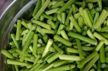 2、把准备好的新鲜蒜苔去掉根部,用淡盐水浸泡十分钟,取出以后用清水洗净,再把它切成段状,然后在锅中放清水,加少量食用盐,等食用盐化开以后,关火降温。