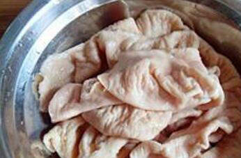 把购买回来的新鲜猪大肠翻厂以后,放在盆中,加入足量的面粉,用手把它调匀,然后再用手来回揉搓,使面粉与猪大肠表面的粘液物质与油脂充分接触,如做大约十分钟左右,再把它放到流水下冲洗干净。