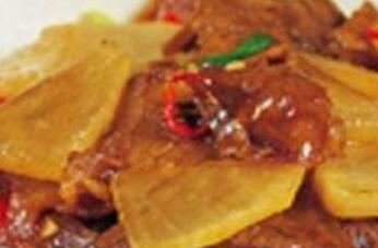 3、在炒锅中放油加热以后,把生姜入锅炒出香气,然后把肉片入锅,快速翻炒,炒到肉片变色以后,放入准备好的白萝卜片,快速翻炒均匀。