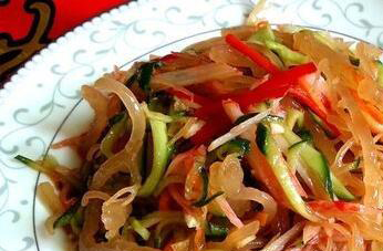 2、珊瑚草需要提前泡发,泡时间不能少于八小时,中间要换水3到5次,准备好了黄瓜和炸豆腐皮,用开水过一遍,然后再把它们切成丝状,泡好的珊瑚草也切成小段。