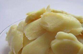 2、把晾干水分以后的生姜切成片状,切出的姜片薄越好,切好以后另少量食用盐腌制两个上时,把腌出的水分去掉不到。