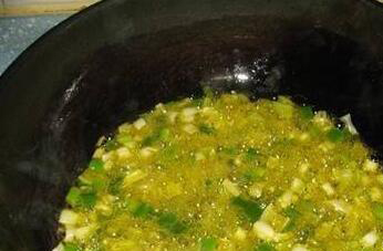 2、把大葱去掉葱叶以后切成葱末,把炒锅烧干以后加入适量的调和油,这里一定要多放油,油温加热到70度以后把葱花入锅。