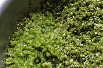 2、把韭菜花洗净以后去掉水分,蒜去掉外皮,苹果去掉外皮切成块儿状,生姜洗净切碎,把它们一起放到小石臼中捣碎,制成泥状,取出以后加入食用盐和香油调匀以后装入可以密封的瓶子中,一两天就能入味,而且这样腌好的韭菜花保质期特别长,保存得当一年也不会变质。