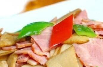 2、把杏鲍菇洗好以后切成片状,培根也切成片,葱姜蒜全部切片,在锅中放油加热以后放入葱姜炒香,再放入辣椒炒出香味,随后把培根入锅。