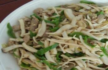 3.另用两大匙油炒鸡腿菇,再将肉片回锅同炒,最后放入青蒜及所有调味料(2),炒匀即克盛出。