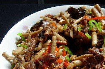 3、起锅上油,用少许油先将牛肉丝滑散,肉丝变色后,略放酱油炒熟后盛出,再用少许油煸香生姜,洋葱粒,倒入绰好水沥干的茶树菇翻炒,放炒好的牛肉丝,略放盐,糖,淋上麻油,大火煸炒五分钟既可。