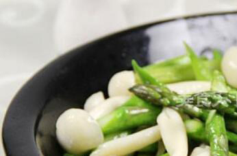 8、下入沥干水分的芦笋和白玉菇。
