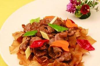 2、把里脊肉洗净后用刀切成薄片备用,然后把青椒也需要切成小小的薄片。