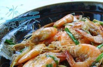 5.放入葱叶段,翻炒均匀即可。(注:虾从进锅到出锅大概是5~6分钟左右,盐要适当的少放点,咸了就不好吃了)。