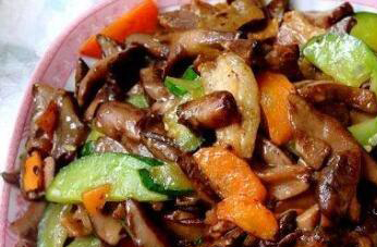 3.然后倒入菌菇翻炒。