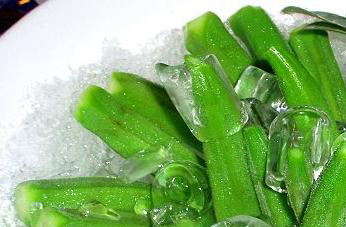秋葵有多种不同的吃法,冰镇秋葵是最好吃的一种,平时制作时可以准备秋葵适量,冰块适量,清水适量,把准备好的秋葵洗好以后,在锅中烧开水,把秋葵入沸水焯一下,三分钟以后取出,放入到冰水中快速的降温,然后取出去掉头和尾,再用刀把秋葵切成两半,摆放在冰盘上,直接上桌食用就可以了。