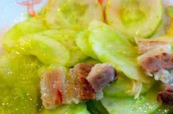第四步:瓜片变熟后加入肉条再一起翻炒。