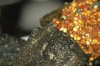 2、把长毛以后的豆腐粘上白酒,再把花椒粉和辣椒粉以及盐与桔皮丁和姜末放在一起调成料,粘在豆腐块的表面上。