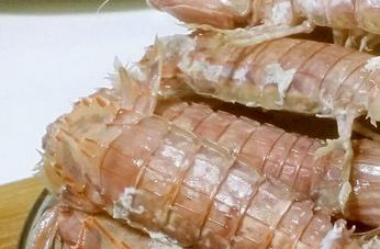 3、把蒸好的皮皮虾取出,略降温,然后把尾部的小脚拧断,把尾部去掉,再去掉整个虾壳,这时就能得到整个的虾肉,用筷子夹起虾肉,醮食调好的酱料直接食用就可以。