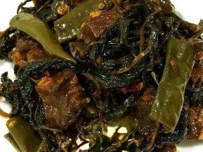 锅中放入适量的食用油,把葱姜片放入锅中小炒,放入干辣椒,然再放入牛肉,小炒一下,再放入适量的清水,最好是把牛肉煮制成五分熟的样子,然后再放入备好的婆婆丁咸菜,婆婆丁咸菜因为是盐的,食用一般也不要放太多的盐,然后把盖子盖上再小煮一下。