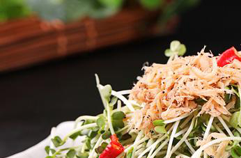 萝卜炒虾皮也很好吃,在炒制里需要准备一大把虾皮和四百克萝卜苗,另外再准备食用油和食用盐以及葱花。把萝卜苗洗好以后切开,把虾皮也用清水洗一下,起锅放油加热以后把葱炒香,随后放入萝卜苗炒制,炒匀以后加入食用盐,随后放入虾皮,一起翻炒一分钟,直接出锅装盘就能食和。