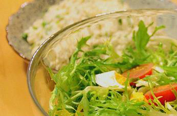 3、把苦苣菜和火腿丝以及圣女果全部放在一起,加入沙拉酱调匀,再加入适量的白糖,最后把黑胡椒磨成细末撒在里面,一份清爽可口的苦苣菜沙拉就做好可以食用了。